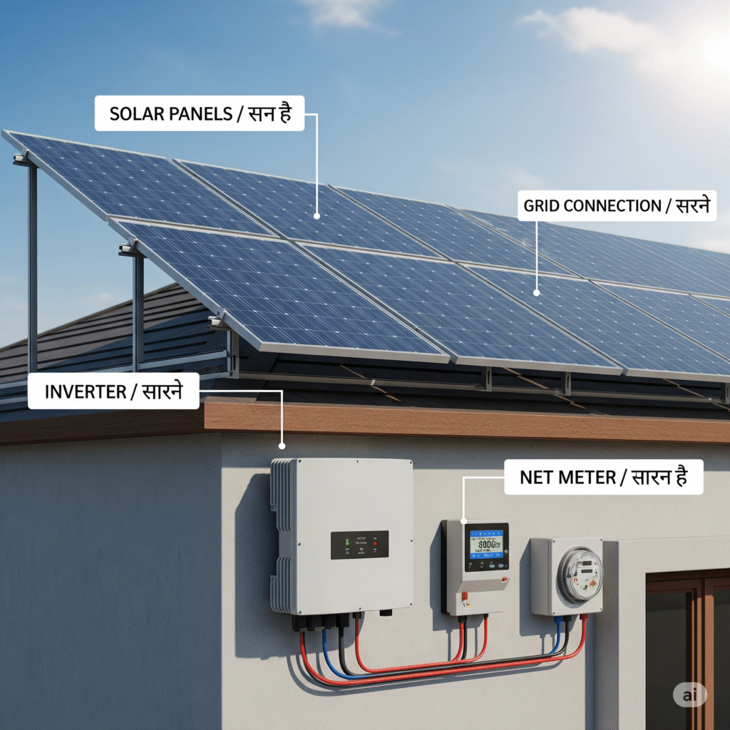 ➡️ आसान शब्दों में कहें तो आपके घर की छत पर लगे सोलर पैनल सूरज की रोशनी को बिजली में बदलते हैं और यह बिजली सीधे ग्रिड से जुड़ जाती है।